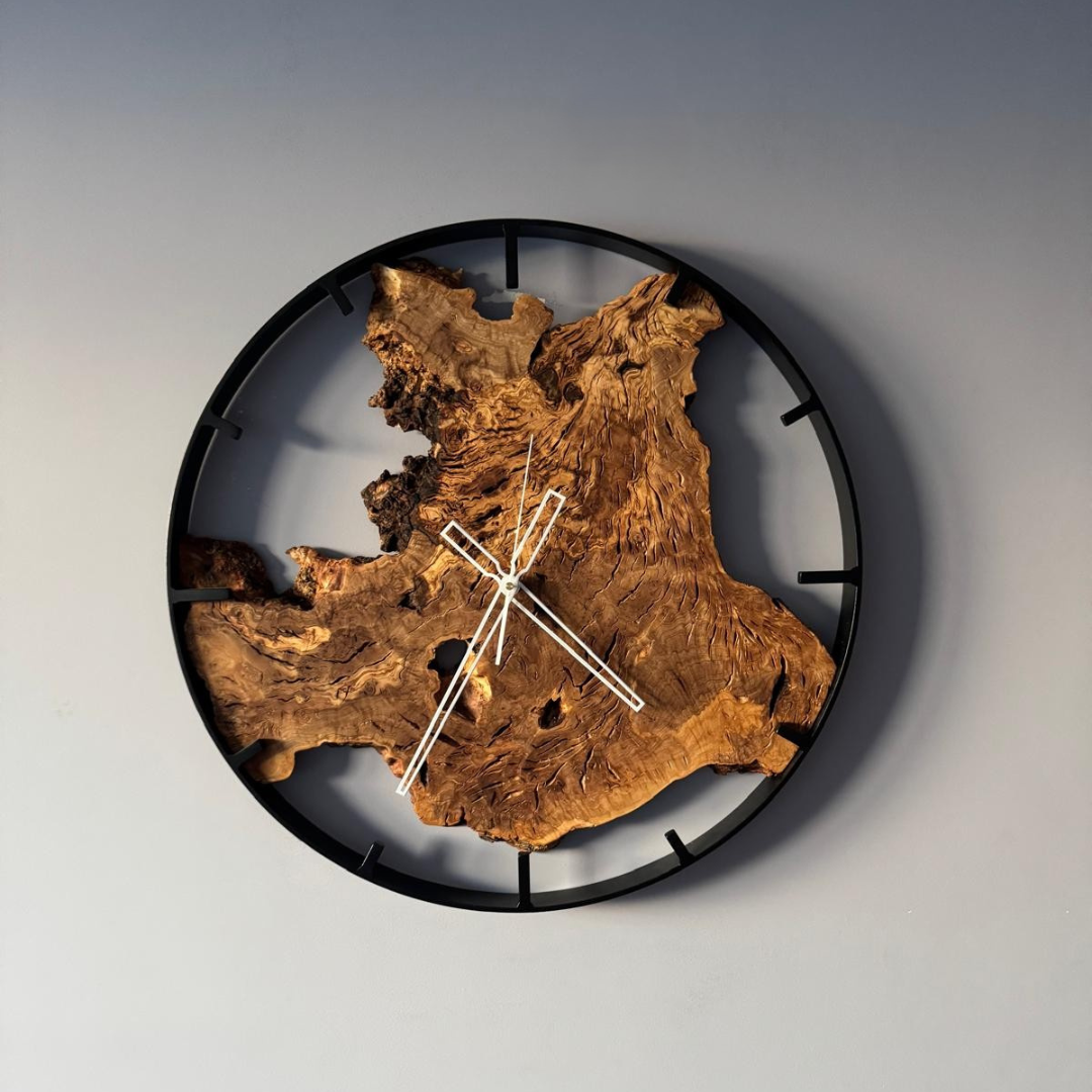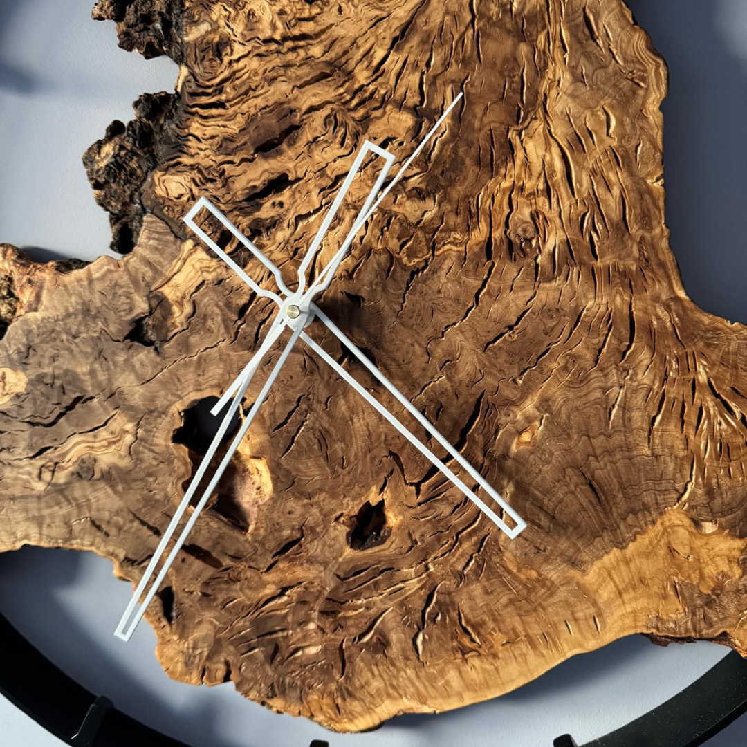 Rustykalny zegar ścienny z drewna oliwnego w stylu loft. Ręczna praca i naturalny charakter drewna.