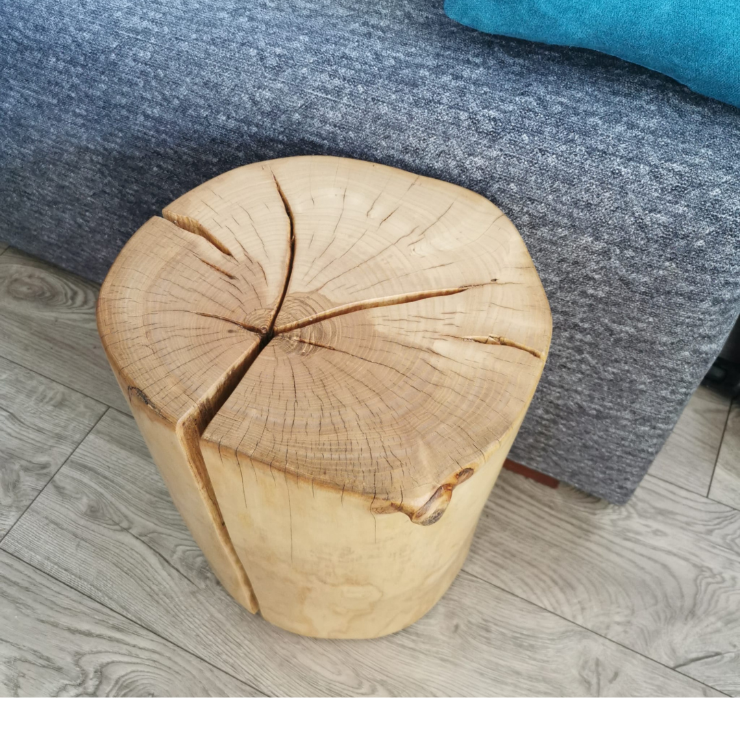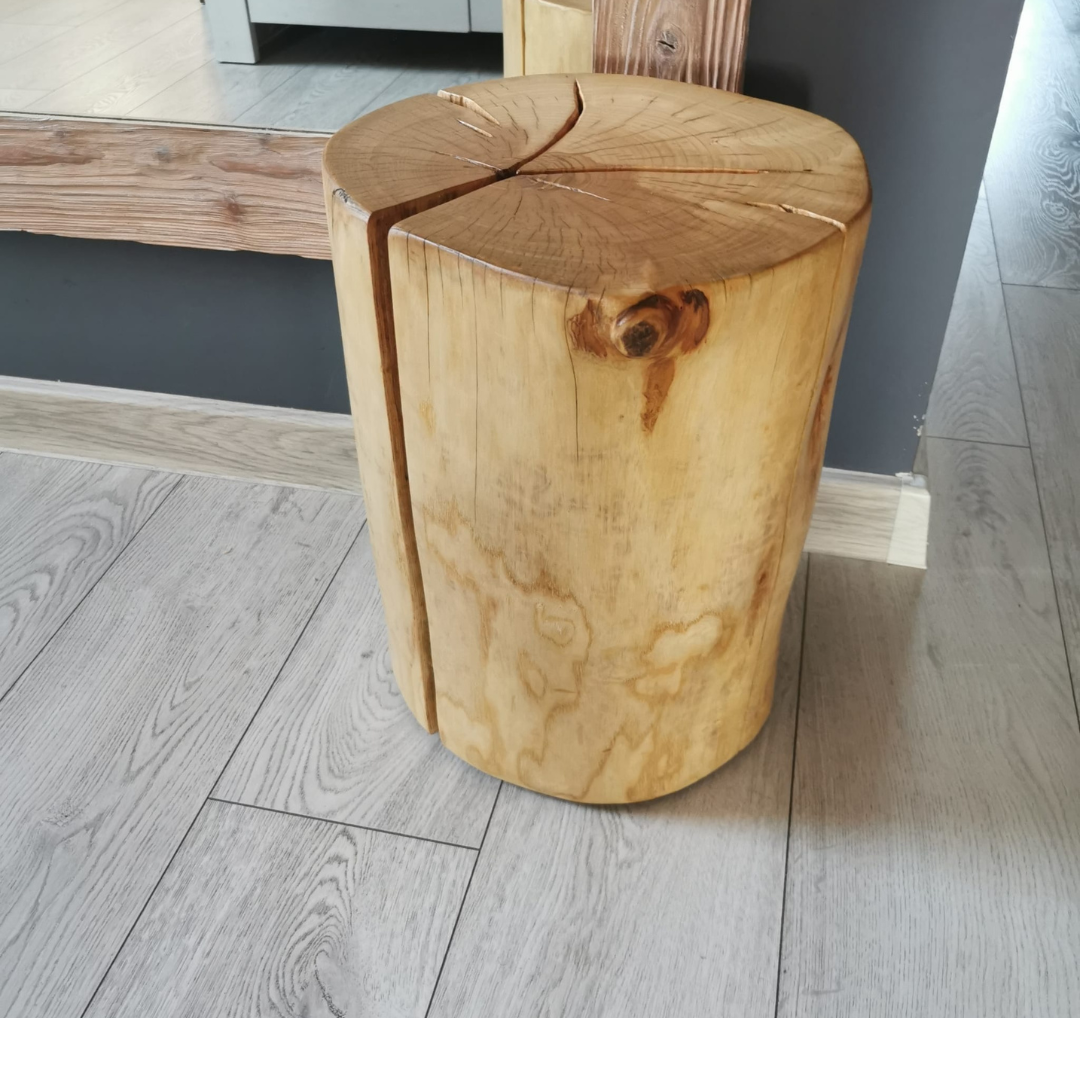 Każdy stolik powstaje ręcznie i zachowuje naturalne cechy drewna, takie jak nieregularności czy drobne pęknięcia, które podkreślają jego autentyczny charakter.