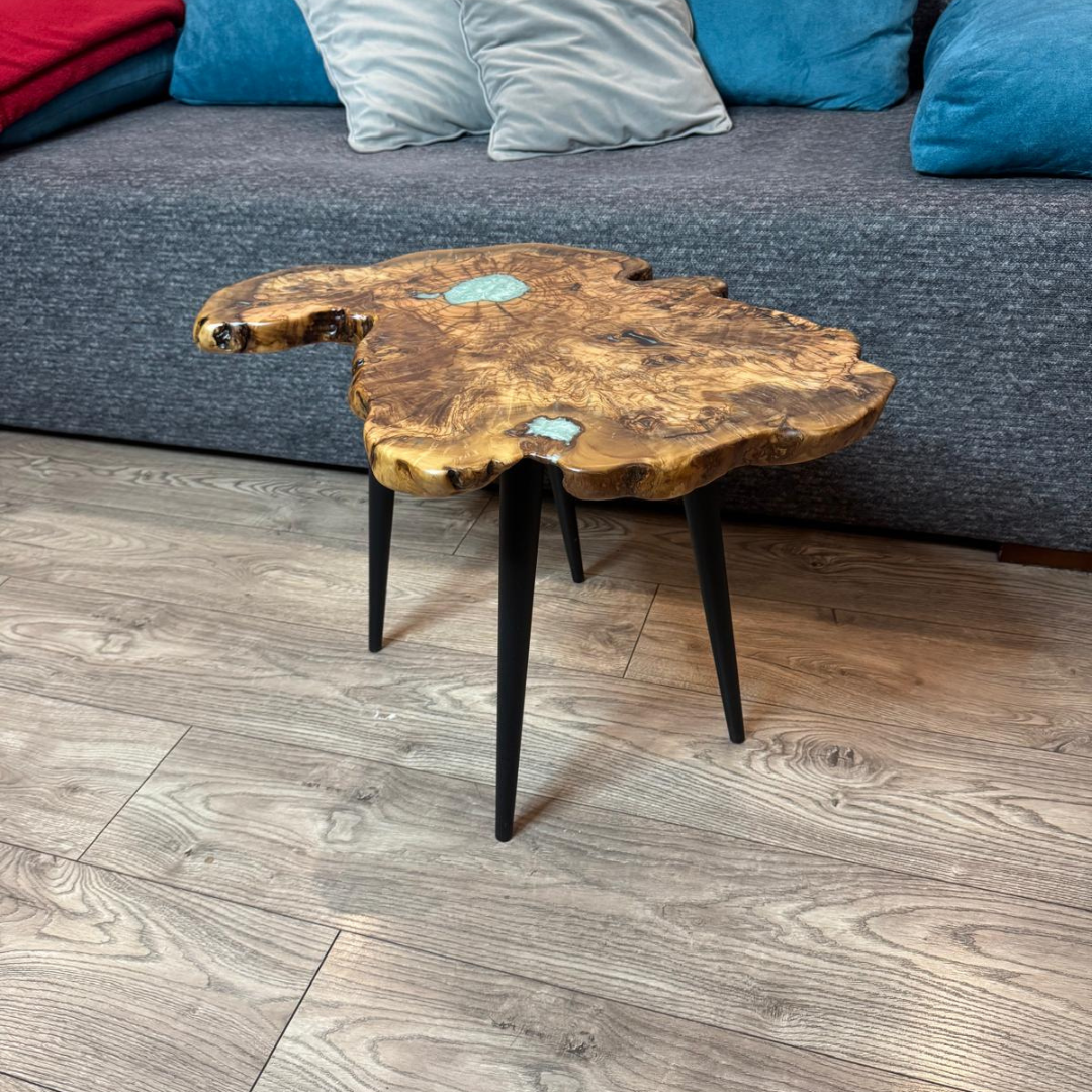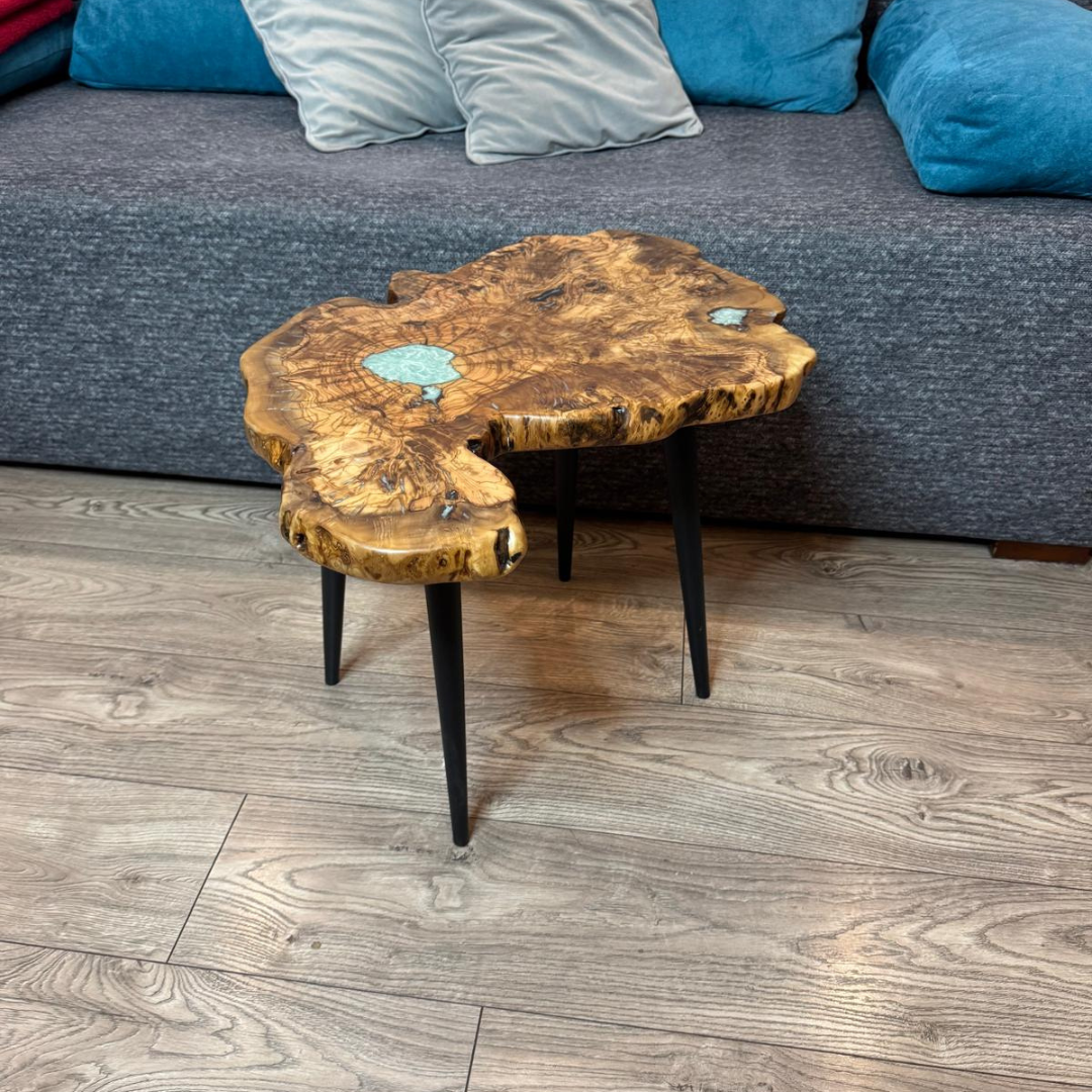 Ten stolik kawowy łączy naturalne piękno drewna oliwnego z artystycznym akcentem błękitnej żywicy epoksydowej. Każdy egzemplarz jest unikatowy – kształt blatu odzwierciedla naturalne słoje i nieregularności drewna, które zostały podkreślone matowym lakierem, nadając powierzchni elegancki, nowoczesny wygląd.