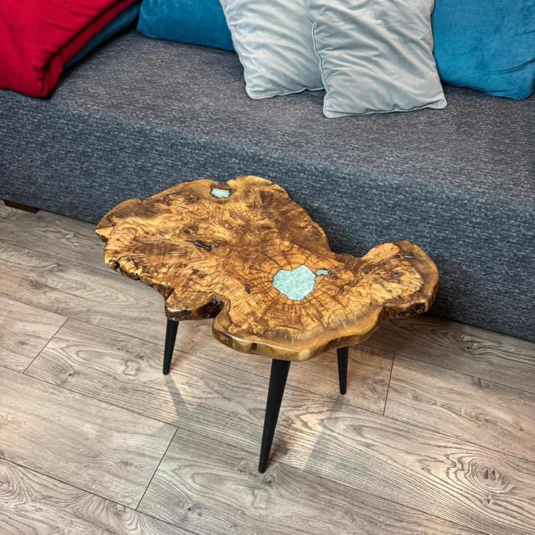 Stolik doskonale sprawdzi się jako centralny punkt salonu, miejsce na kawę, książki lub dekoracje. Połączenie drewna oliwnego, matowego lakieru i błękitnej żywicy tworzy niepowtarzalny mebel, który przyciąga uwagę i dodaje wnętrzu wyjątkowego charakteru.