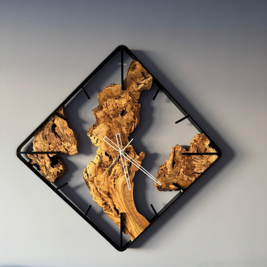 Unikatowy duży zegar ścienny z drewna oliwnego w stylu loft. Ręczne wykonanie i naturalny charakter. Parametry Techniczne